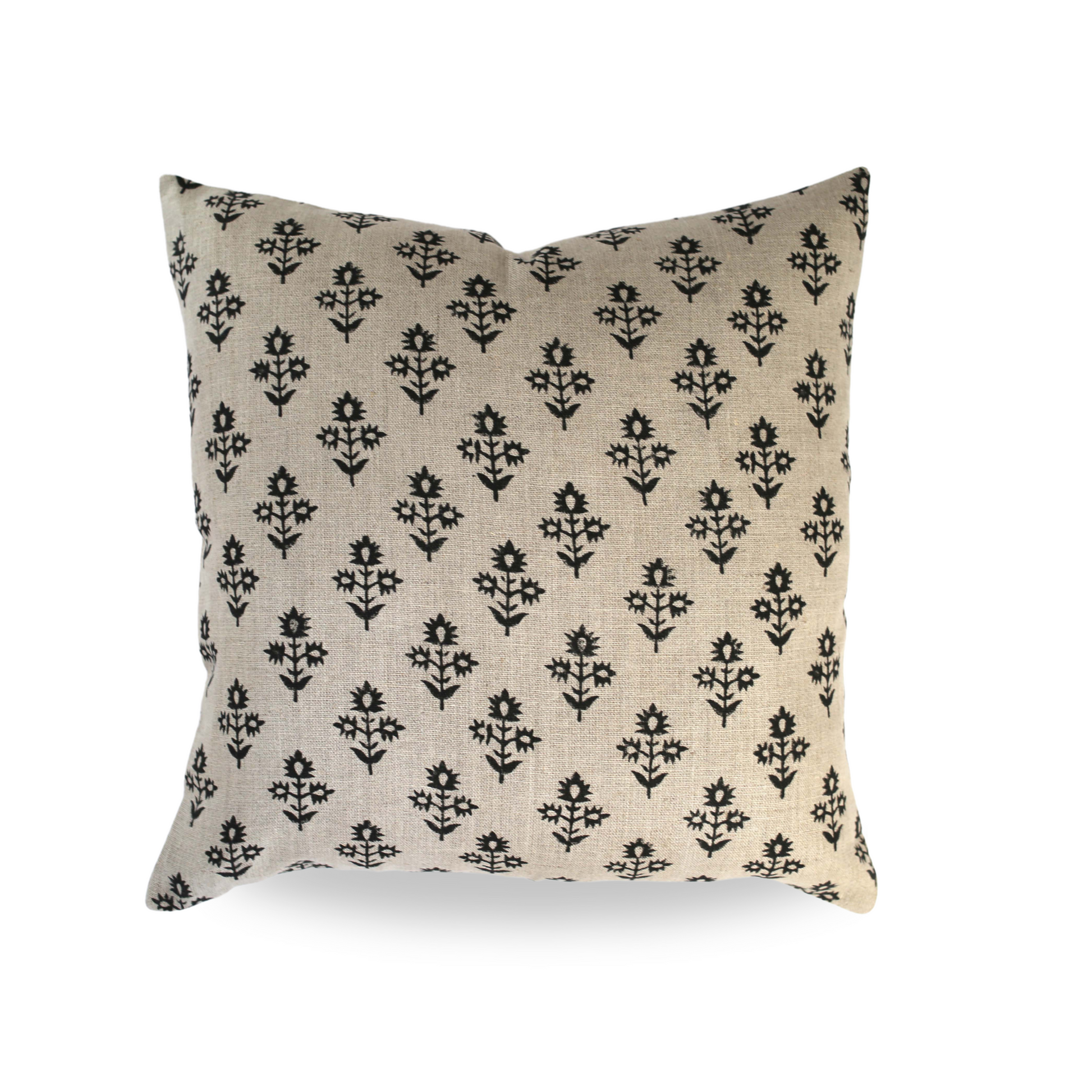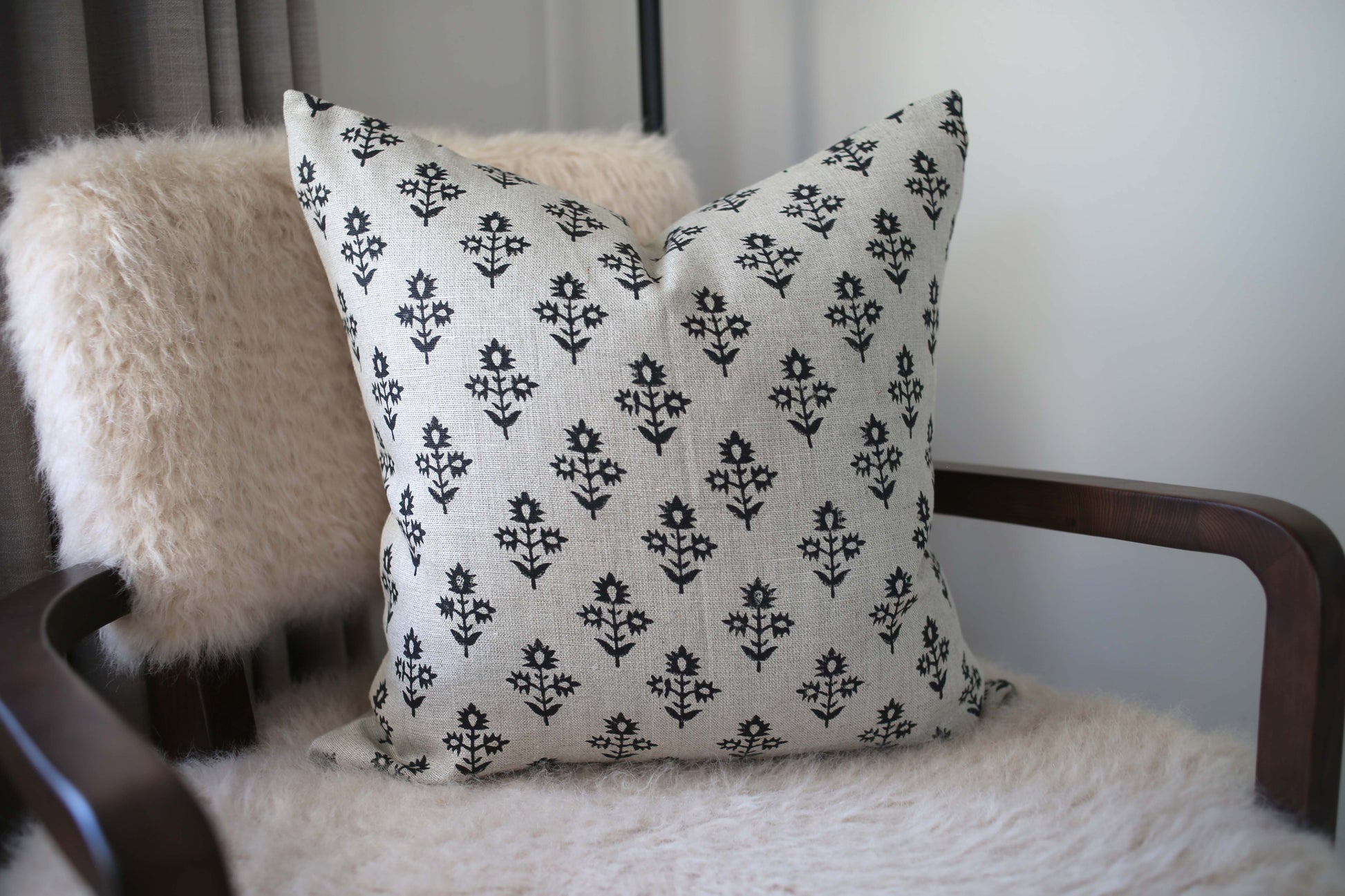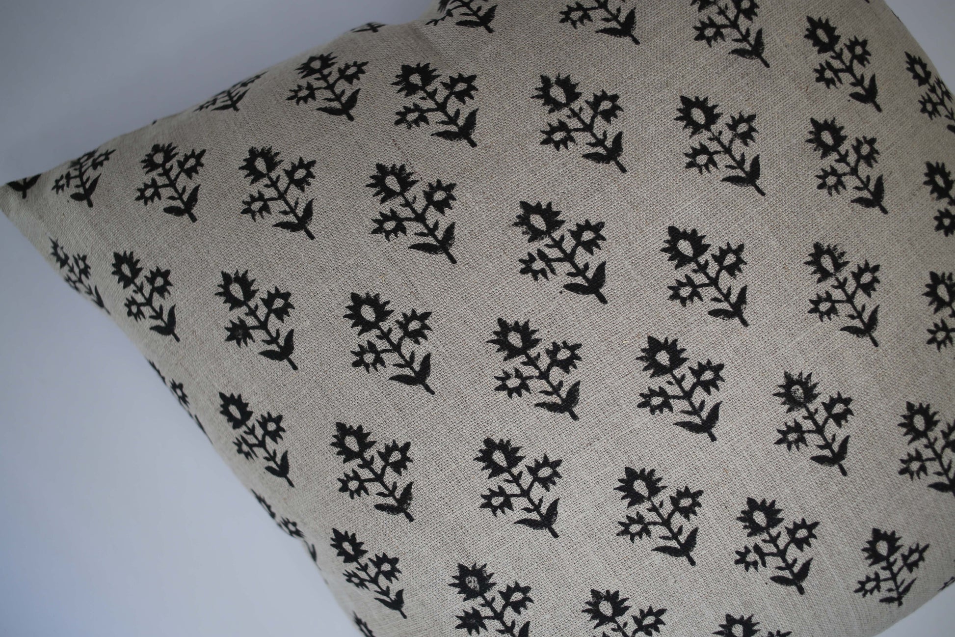 Elevate your decor with our hand-made, hand-stamped block print linen pillow cover in this black and white floral print. Crafted from 100% thick linen, this pillow cover is perfect for any space. Available in both 20" and 22" squares and a 14x20" lumbar with a matching print backside.