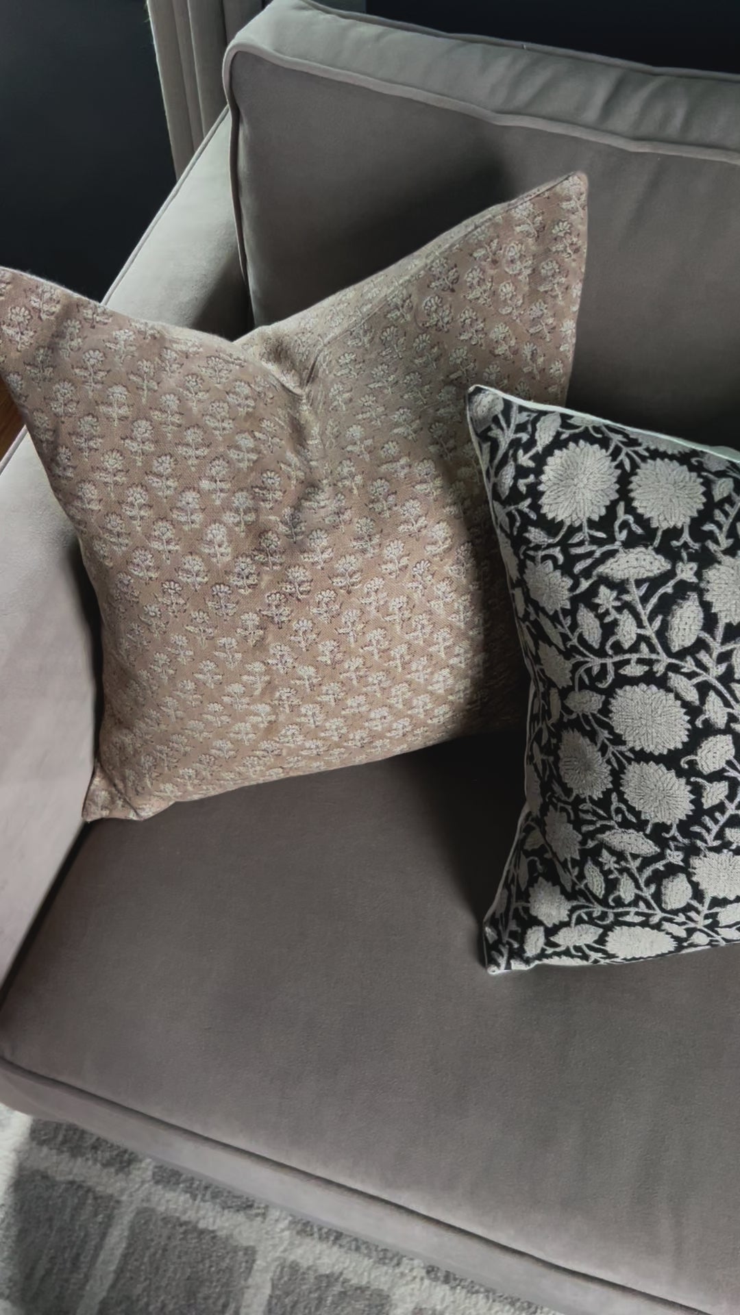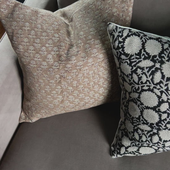 Elevate your decor with our hand-made, hand-stamped block print linen pillow cover in this beautiful floral print. Crafted from 100% thick linen, this neutral cover features a black and tan floral pattern - a perfect addition to your couch or bed and pairs perfectly with stripes and small scale floral. Available in both 20" and 22" with a off-white thick linen backside.