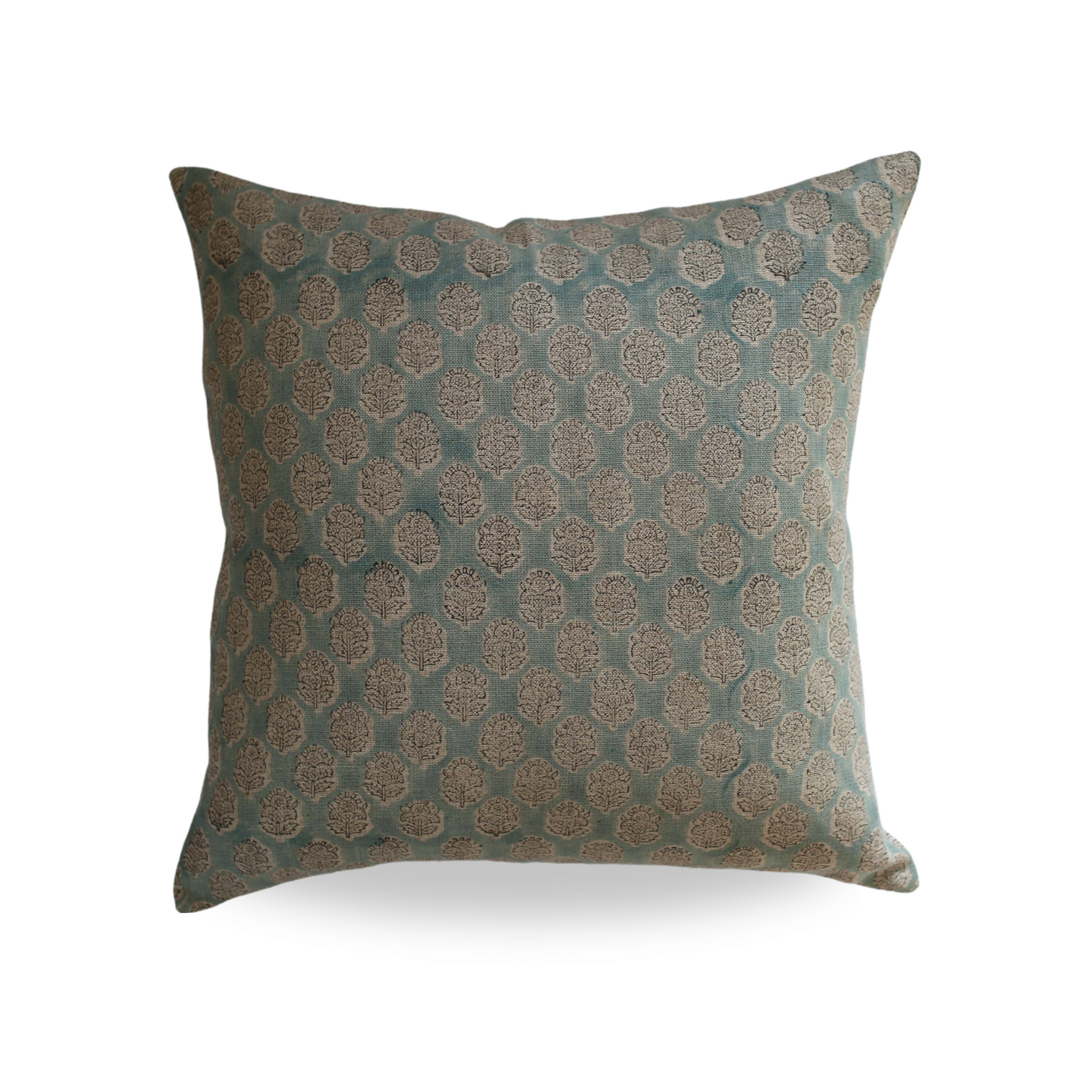 Elevate your decor with our hand-made, hand-stamped block print linen pillow cover in this neutral floral motif print. Crafted from 100% thick linen, this pillow cover is perfect for the neutral home - tones of pale blue, navy and cream. Available in 20", 22" and 14x20" lumbar with a solid off-white thick linen backing.