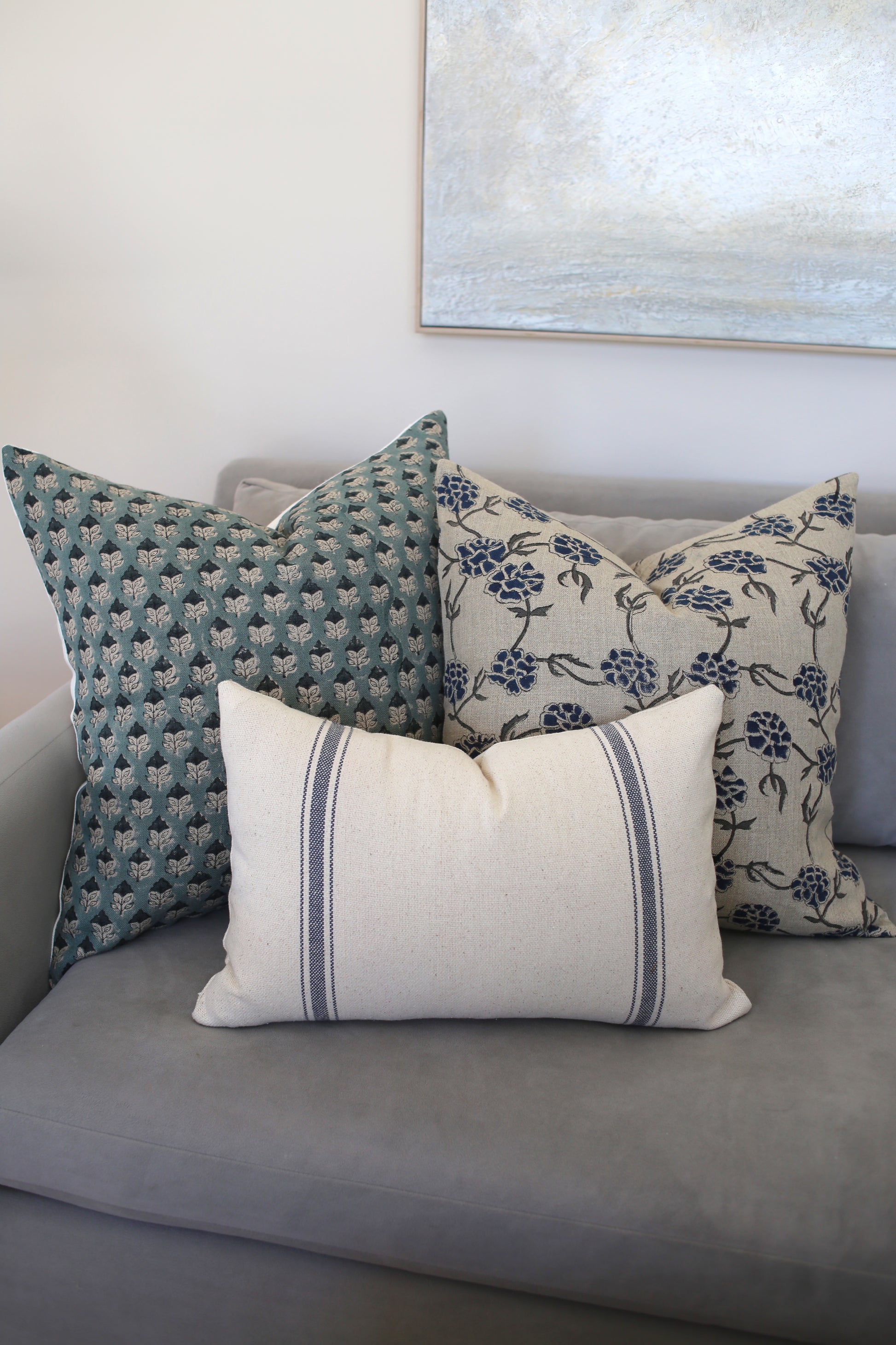 Our popular trio containing shades of blue. This set contains a 22", 20" and 14x20" lumbar cover.